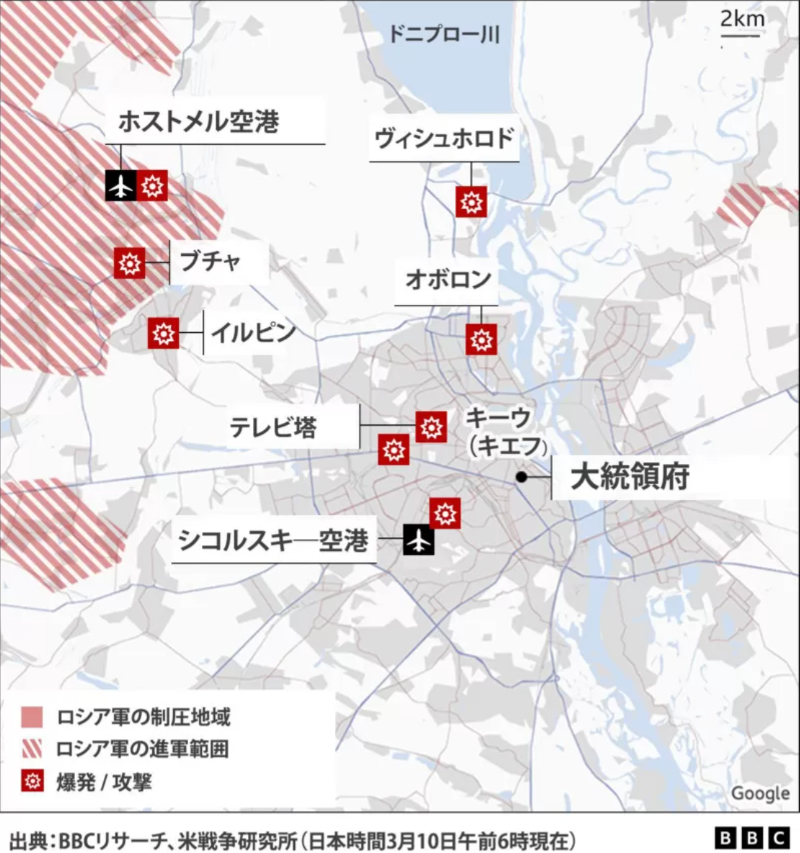 1日前の占領地域と比較するとキーウ北西部の占領地域が広がっています。